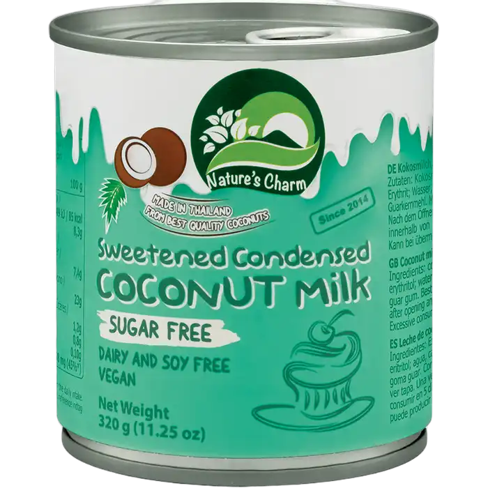 Nature's Charm Gesüßte Kokosmilch zuckerfrei vereint cremige Kokosmilch mit der milden Süße von Erythrit – ganz ohne Zuckerzusatz. Mit 77 % Kokosmilch bietet sie ein intensives Aroma und ist die perfekte Alternative für laktosefreie und vegane Rezepte.