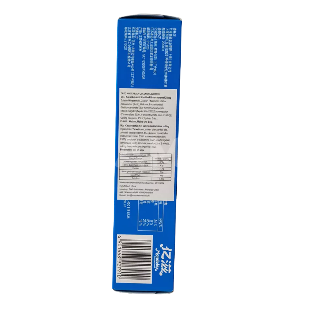 OREO Sandwich Biscuit Peach Oolong 97G – eine außergewöhnliche Geschmackskombination aus zart-herber Oolong-Teearomatik und fruchtigem Pfirsich, eingebettet in die beliebten knusprigen OREO-Kakaokekse. Diese exklusive Variante aus China bringt eine asiatisch inspirierte Note in den klassischen Keksgenuss und begeistert durch ihre cremige Füllung mit leichtem Teearoma und fruchtiger Süße.